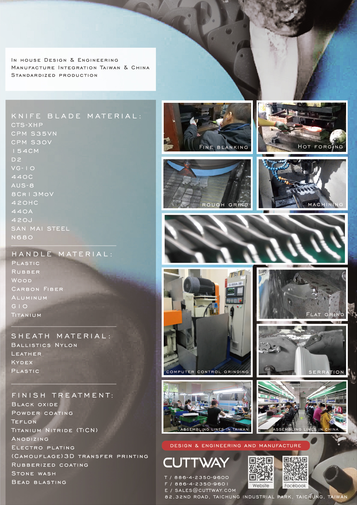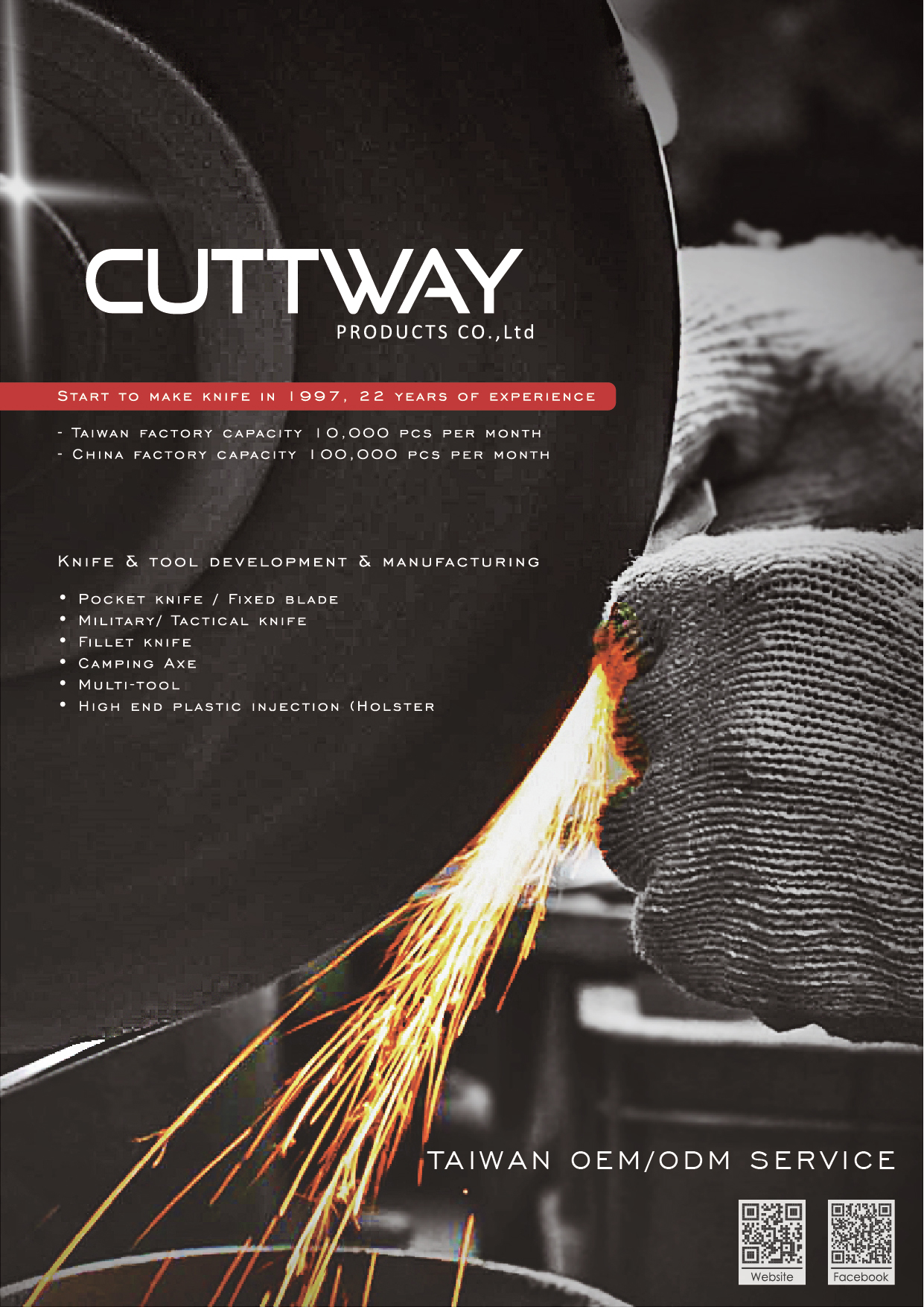 CUTTWAY PRODUCTS CO., LTD. originated in Taichung, Taiwan is a professional manufacturer engaged in the research, development, manufacturing and customer service of diversified cutlery knives and accessories for years. It’s facilities locate in both Taichung, Taiwan and Guangdong, China to satisfy the wide range of product demands for the clients worldwide.